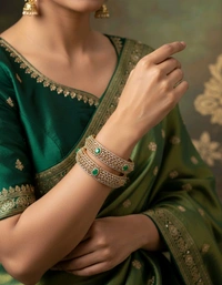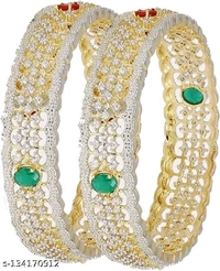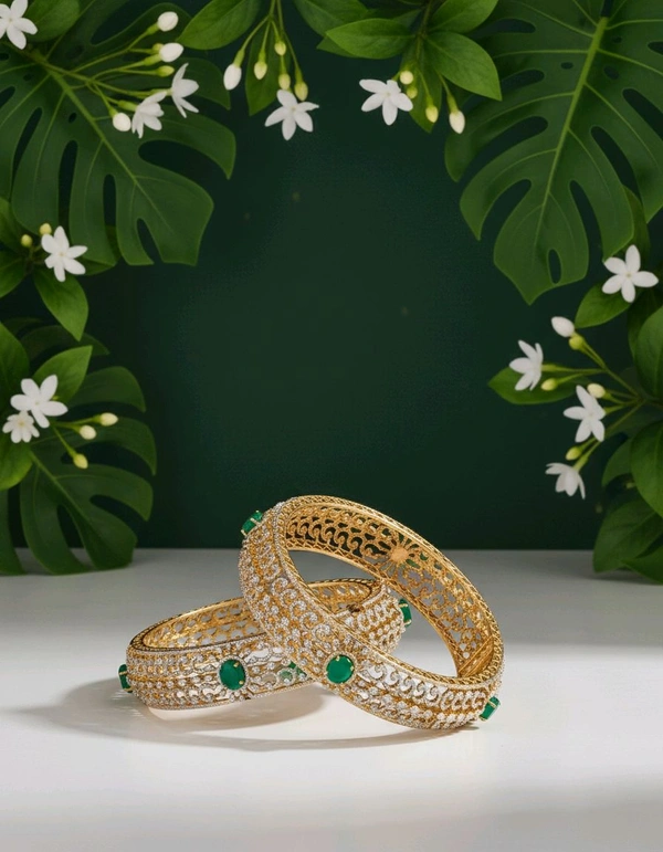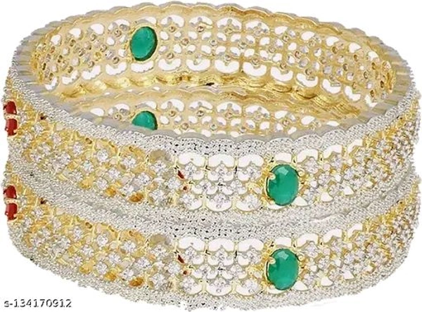 Bracelet & Bangles Name: Bracelet & Bangles Base Metal: Alloy Plating: Gold Plated Stone Type: Cubic Zirconia/American Diamond Sizing: Non-Adjustable Type: Bangle Style Net Quantity (N): 2 Sizes:2.4, 2.6, 2.8, 2.10 Introducing our JSD Gold-Plated Bangle Set, a symbol of radiant elegance and timeless beauty. Exquisitely crafted, these bangles are designed to adorn your